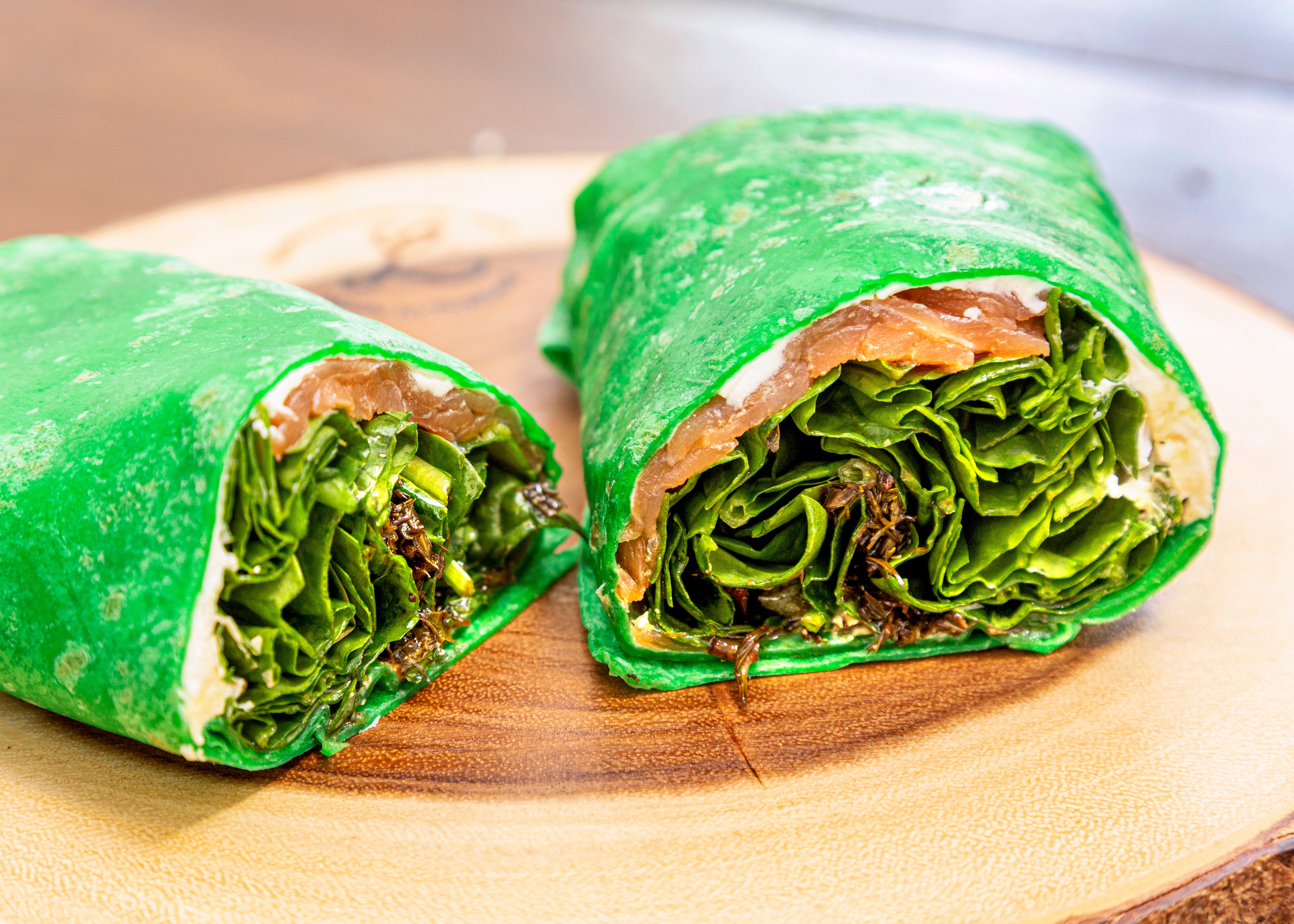Spinach wrap, cream cheese, lettuce, smoked salmon, capers, red onions, house sauce
